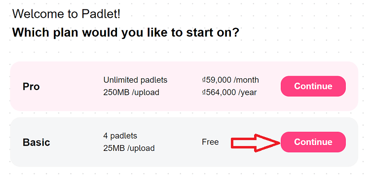 – Sau khi đăng ký xong, chúng ta sẽ lựa chọn loại tài khoản. Ở đây chắc chắn rồi các thầy cô sẽ chọn loại “Basic” gói Free như hình rồi bấm “Continue”
