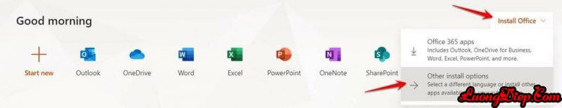 Sau khi đổi Password xong, bạn sẽ vào được giao diện App Office 365 E3. Tại đây bạn có thể dùng các ứng dụng Office trực tuyến. Nếu muốn Download bộ Office này và cài đặt vào máy tính, bạn click vào Install Office -> Other install options.