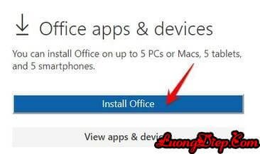 Tại mục Office apps & devices, bạn click vào Install Office để tải bộ Office và cài đặt vào máy tính. Sau khi cài xong thì đăng nhập vào bằng khoản bạn đã tạo ở trên (xxx@stulive.com).