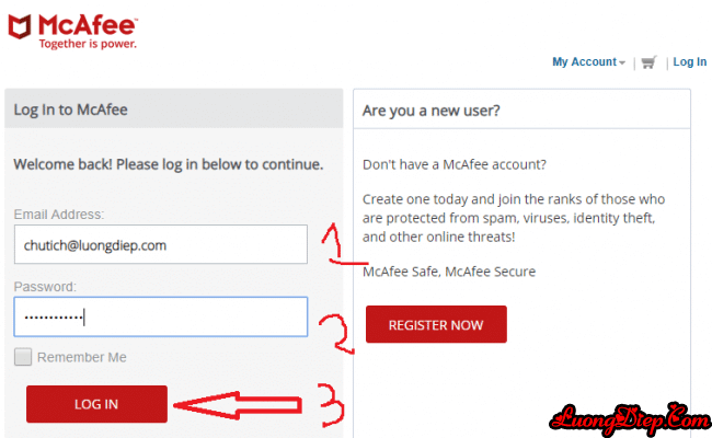 7. Sau khi bạn cài đặt xong phần mềm sẻ yêu cầu đăng nhập thì hãy đăng nhập để có thể sử dụng miễn phí McAfee Internet Security trong vòng 6 tháng.